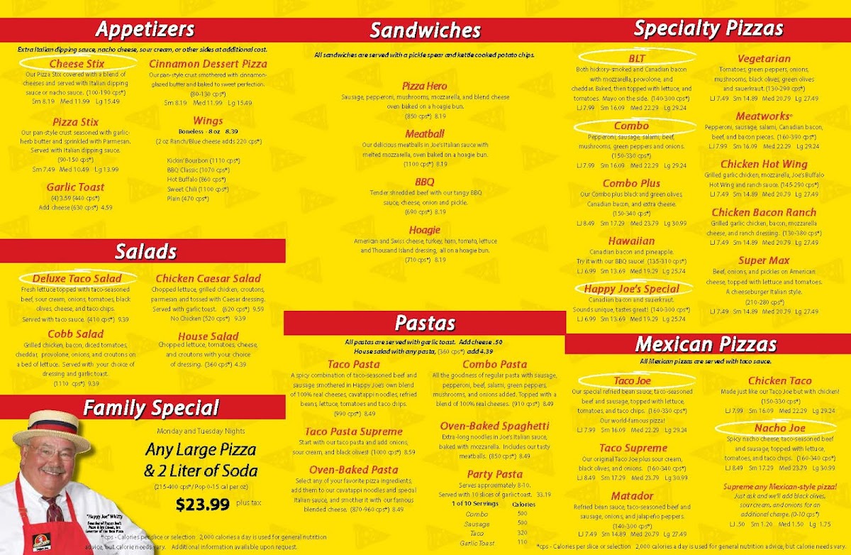 The menu at Happy Joe's Pizza in Moline offers a delicious array of options that cater to all kinds of tastes. Among their standout items is the Taco Pizza, a flavorful combination of traditional taco toppings on a pizza crust, delivering a fun and satisfying twist on the classic. If you're a fan of simplicity with a classic taste, the Pepperoni Pizza is a must-try, featuring crispy, savory pepperoni atop a perfectly baked crust. For those who enjoy a bit of heat, the Chicago Sausage and Green Peppers pizza adds a spicy and savory punch, while the Happy Joe's Special Pizza brings a delightful mix of toppings, making it a crowd favorite.